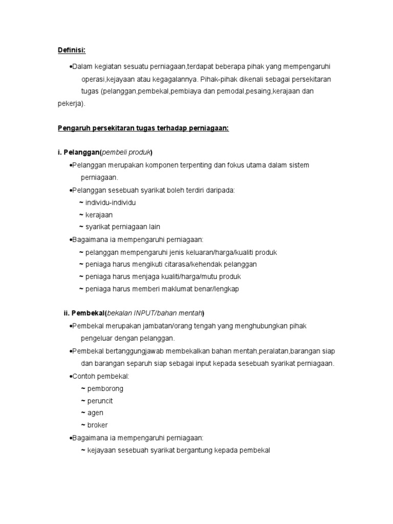 Definisi Siluet from facts-news.org Baca juga artikel yang mungkin berhubungan : Persekitaran tugas ialah merangkumi sektor luaran organisasi yang berinteraksi secara langsung dan mempunyai kesan langsung terhadap keupayaan organisasi untuk mencapai persekitaran organisasi. Manajemen sendiri sebagai sebuah teori pengorganisasian muncul pada akhir abad 19. Definisi konsep menurut para ahli. 1.1 pengenalan perniagaan a) definisi perniagaan b) objektif perniagaan 1.2 kepentingan perniagaan 1.1 pengenalan perniagaan 1.1.1 definisi perniagaan aktiviti jual beli barang dan perkhidmatan dengan menggunakan wang @ alatan lain bagi. Pengertian pertanian menurut para ahli. Assalamualaikum dan salam sejahtera,saya ingin berkongsi video ringkas pdpc mata pelajaran perniagaan tingkatan 4 bagi subtopik 2.2 trend persekitaran. Oleh itu, usahawan harus sentiasa memantau serta mengambil tindakan ke atas.